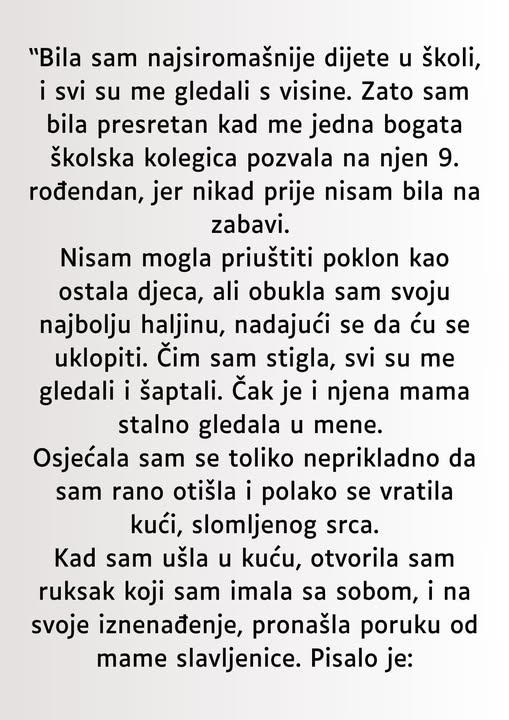 Zato sam, kada sam dobila pozivnicu za rođendan jedne od najpopularnijih djevojčica u razredu, osjetila nešto između uzbuđenja i straha. Nikada nisam bila dio takvog društva, a ta pozivnica izgledala je kao mala ulaznica u svijet kojem sam se dugo divila, ali kojem nikada nisam pripadala. Moji roditelji nisu imali mogućnost kupiti skup poklon, ali nisam željela propustiti priliku. Htjela sam, barem jednom, biti dio nečega.