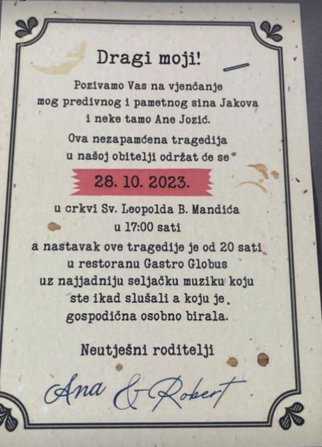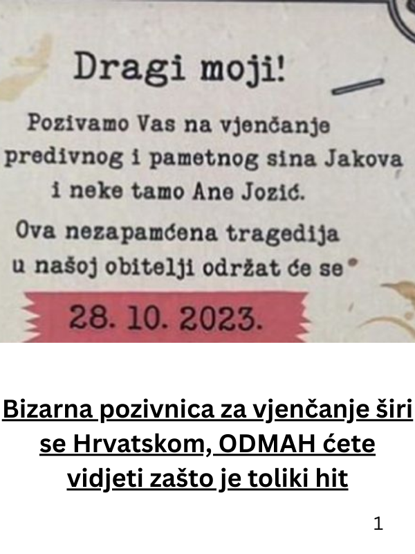 Danas ćemo pisati o neobičnom dogažaju koji se dogodio u Hrvatskoj. Uspio je da izazove mnoge reakcije na društveni mrežama, a u pitanju je pozivnica za vjenčanje koju su roditelji mladoženje poslali.