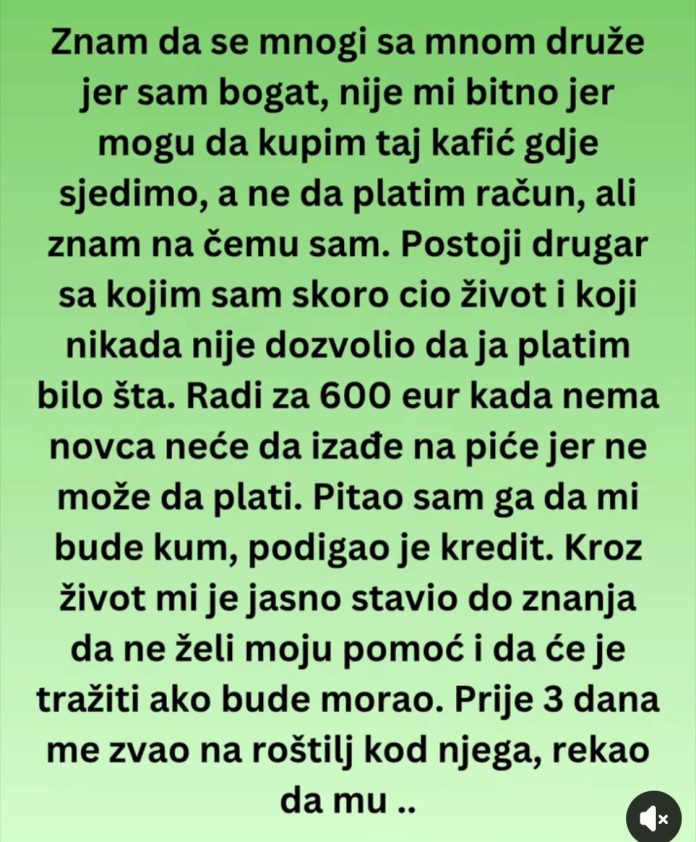Tri dana prije nego što se dogodio najvažniji trenutak ove priče, kum ga je pozvao na skroman roštilj. Bilo je to mirno okupljanje, ništa posebno, ali upravo u tim jednostavnim trenucima dolazi najviše topline i razumijevanja. Dok su razgovarali, kum mu je saopštio da je njegova žena trudna. Bio je vidljivo sretan, ali i zabrinut. Novi život donosi radost, ali i dodatnu odgovornost, osobito kada budžet nije veliki. Na kraju je spomenuo da mu treba bolji posao, ali nije to rekao kao molbu, već kao konstatujuću rečenicu.
