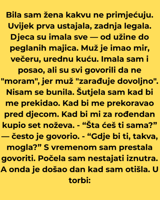 Bila sam žena koju nisu primjećivali. Nevidljiva u vlastitom domu, moja svakodnevna žrtva za obitelj bila je dio životne rutine. Prva sam ustajala, zadnja legla. Zaduženja su bila jasna i jednostavna – pripremiti užinu djeci, očistiti kuću, peglati njihova odijela i kuhati večere. Moj muž je uvijek imao mir, dok sam ja vodila urednu kuću, ali nikada nisam osjećala da sam zaista bitna. Djeca su imala sve što su htjela, a muž je imao sve – od večere do relaksacije, dok su moji vlastiti potrebe ostajale zanemarene. Iako sam imala svoj posao, svi su govorili da „ne moram raditi jer muž zarađuje dovoljno”. Nikada se nisam bunila, jer sam vjerovala da je to moje mjesto – sve za njih, a ništa za mene.