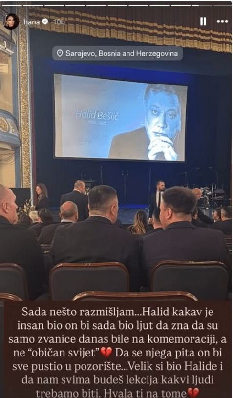 Hana Hadžiavdagić, kao i mnogi drugi, bila je duboko potresena gubitkom velikog umetnika Halida Bešlića, ali se posebno osvrnula na način na koji je komemoracija održana. Na Instagramu je istakla da bi Halid, da je bio prisutan, bio ljut zbog činjenice da su na komemoraciji prisutni bili samo zvanice, dok su brojni obožavaoci bili isključeni. Hana je naglasila da bi Halid, kao takav čovek kakav je bio, sada bio ljut što „običan svet“ nije imao priliku da prisustvuje, i poručila: „Halid kakav je insan bio, on bi sada bio ljut da zna da su samo zvanice bile na komemoraciji, a ne ‘običan svet’”. Hana je dodala kako bi Halid, da je on odlučivao, „sve pustio u pozorište”, govoreći o tome kako bi pevač želeo da svi, bez obzira na status, imaju priliku da mu se poklone.