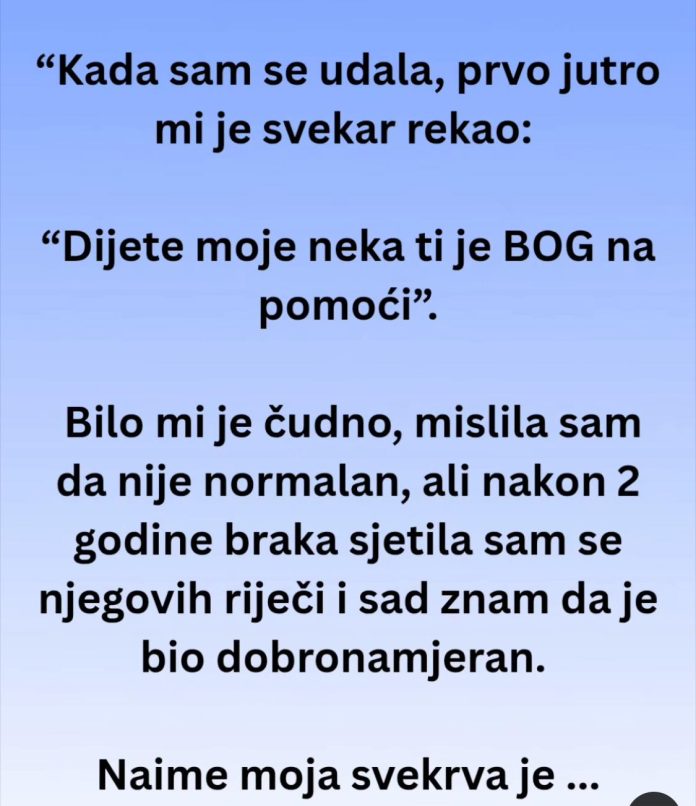 Danas ćemo pisati o ispovijesti jedne žene koja je postala mlada i koja je nakon svadbe imala zanimljivu konverzaciju sa svekrom. Tom prilikom joj je rekao nek ti je Bog na pomoći, a šta je to značilo pročitajte u nastavku.