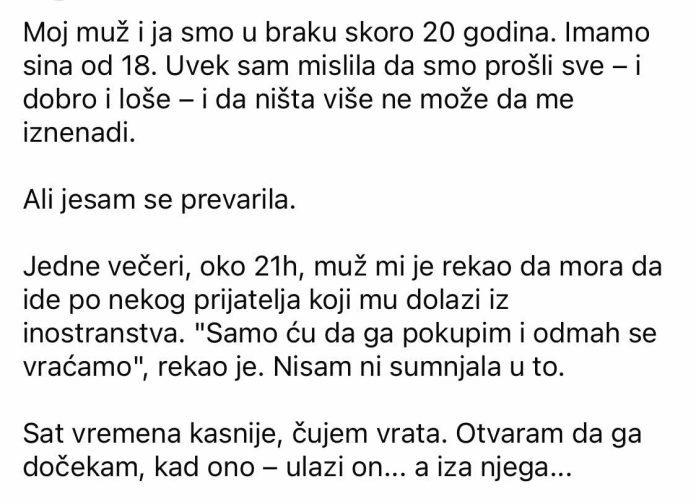 Prirodno je da osećaš bol, šok i zbunjenost nakon svega što se dogodilo. Posle skoro dve decenije zajedničkog života, stvaranja porodice i podizanja deteta, zaslužuješ poštovanje, istinu i dostojanstvo. Suočiti se sa mogućom izdajom na ovakav način sigurno je razorno i teško. Nije jednostavno prihvatiti da se neko, ko je toliko dugo bio deo tvog života, ponese sebično i neodgovorno, bez imalo obzira prema onome što ste gradili.