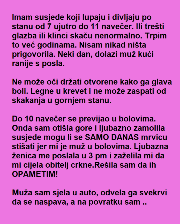 Međutim, vrhunac svega dogodio se nedavno, kada je moj muž došao ranije sa posla. Bio je potpuno iscrpljen, mučila ga je užasna glavobolja i jedva je stajao na nogama. Samo je želeo da se odmori i zaspi. I dok sam gledala svog supruga kako se muči u bolovima, kako pokušava da zaspi, a buka nije prestajala, donela sam odluku da više ne mogu ćutati.