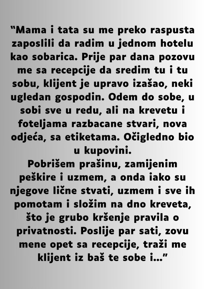 Jednog dana stigao je poziv s recepcije da pospremim sobu gosta koji je upravo napustio hotel. Ušla sam u prostoriju koja je izgledala uredno, ali su fotelje i krevet bili prekriveni vrećicama i garderobom sa etiketama. Na stolu su stajale otvorene boce vina, a u vazduhu se osećao miris skupog parfema. Pomislila sam kako mora biti lepo živeti u takvom svetu gde se novac troši bez razmišljanja. Dok sam slagala stvari, primetila sam da ih guram pod krevet, i u tom trenutku osetila sam da sam narušila granice privatnosti.