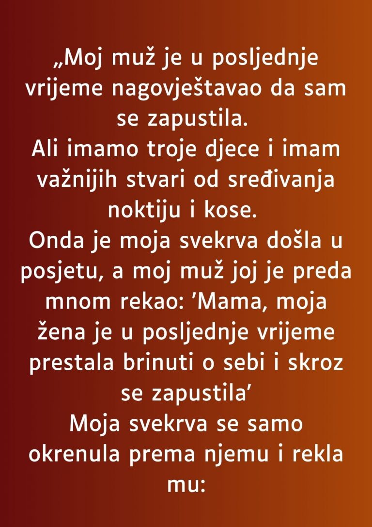 Mnogi brakovi dolaze u faze nesigurnosti, u kojima problemi postaju očigledni, a napetost između partnera raste. Jedan takav trenutak doživela je žena koja se našla u središtu sukoba između svog muža i svekrve. Njen muž primetio je da se promenila, da se zapustila i o tome je otvoreno razgovarao sa njenom majkom, bez imalo obzira prema njoj. Njegove reči bile su: „Mama, moja žena je prestala brinuti o sebi i skroz se zapustila“. Umesto da je podrži, njegove reči izazvale su u njoj osećaj bezvrednosti i nezadovoljstva, a njen odgovor na svekrvin komentar bio je nešto što nije očekivala.