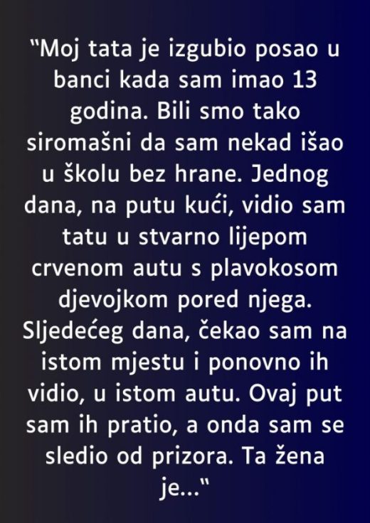 Njegov otac nije reagovao bijesom.Umjesto toga, u njegovim očima pojavile su se suze.Tiho i slomljeno, objasnio mu je istinu. Radio je kao instruktor vožnje. To je bio posao koji je prihvatio kako bi prehranio porodicu, nakon što je izgubio stabilnu poziciju u banci. Nije bilo lako priznati da je pao s nečega sigurnog na nešto neizvjesno, ali nije imao izbora.U tom trenutku, dječak je shvatio koliko su njegove pretpostavke bile daleko od istine.