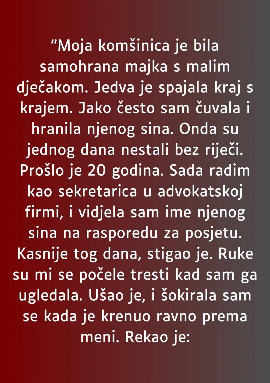 I zaista, bolji dani su došli. Jednog jutra, ispred zgrade sam primetila bijeli kombi sa logom kompanije. Moja komšinica je izlazila iz njega sa osmehom, kao nikad pre. Dobila je posao kao domarka u lokalnoj školi, a njen sin je dobio besplatan produženi boravak. Njen trud, hrabrost i upornost su se konačno isplatili.