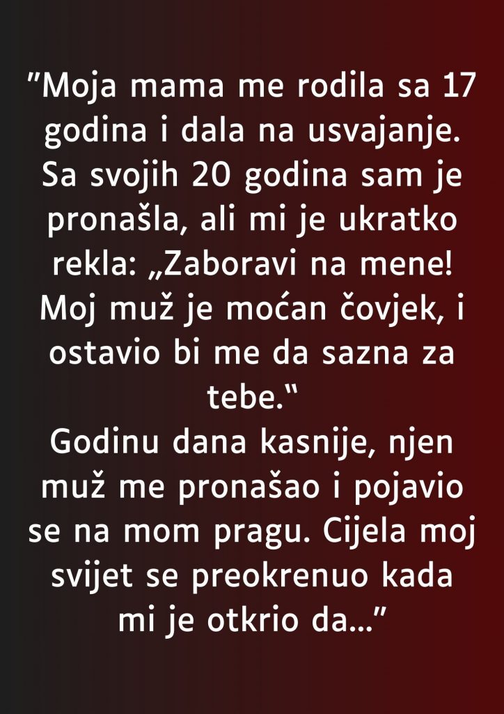 Majka koja me je rodila imala je samo sedamnaest godina. Bila je dijete koje se našlo pred odlukom za koju nijedna osoba tog uzrasta ne može biti spremna. Bez podrške, preplašena i izgubljena, izabrala je put za koji je vjerovala da je najmanje loš – dala me je na usvajanje. Ta odluka nije obilježila samo njen život, već je zauvijek oblikovala i moj. Odrasla sam u drugoj porodici, među ljudima koji su se trudili da mi pruže sigurnost i dom, ali pitanje porekla i identiteta nikada me nije napustilo.