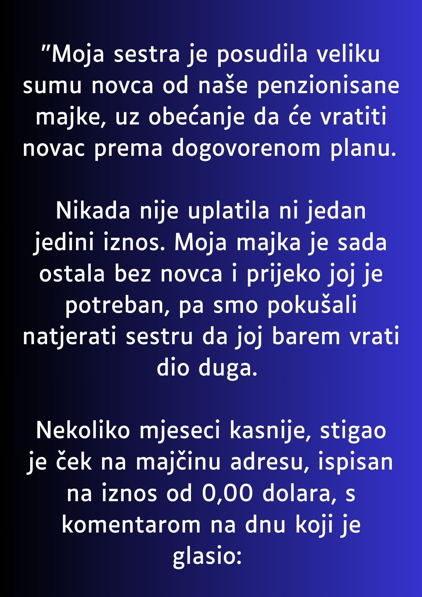 Nažalost, obitelj, iako bi trebala biti temelj na kojem se oslanjamo, ponekad postane izvor dubokih povreda i nesagledivih problema. Moja sestra uzela je veliku svotu novca od naše majke, koja je penzioner i u tom trenutku stvarno trebala pomoć. Sestra je obećala da će novac vratiti u dogovorenim ratama, no ništa od toga nije ispunila. Niti jedan iznos nije uplaćen, što je ozbiljno povrijedilo našu obitelj, jer je majka bila u velikoj nevolji i nije znala kako će se snaći. Kao djeca, osjećali smo odgovornost da nešto poduzmemo i pokušali smo natjerati sestru da barem vrati dio duga. Željeli smo smiriti situaciju jer je to postao ogroman teret na našoj majci.