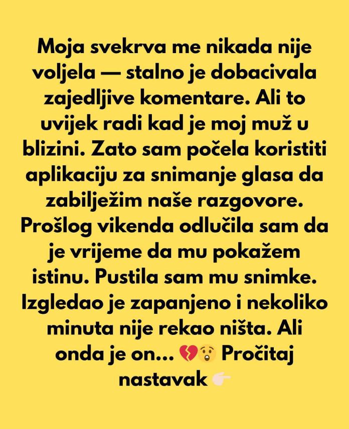Nekoliko tjedana pažljivo je prikupljala dokaze. Nije to bio čin iz hira, nego posljednji pokušaj da pokaže istinu. Snimke su jasno otkrivale stav svekrve: od posprdnih komentara o njenom kuhanju, preko omalovažavanja njenog posla, pa sve do kritika izgleda i odijevanja. Svaka riječ bila je udarac u srž njenog dostojanstva.