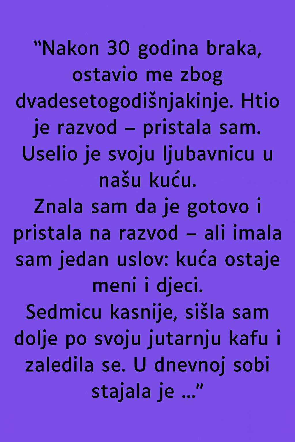 Te večeri, istu poruku je izgovorila svom mužu. Rekla mu je: „Ovo je moja kuća. Neću dozvoliti da ona ili bilo ko koga dovedeš bude ovdje. Ako si izabrao novi život, onda ga živi van ovog doma.“ U njenom glasu nije bilo ni vike ni suza — samo odlučnost žene koja je predugo ćutala.