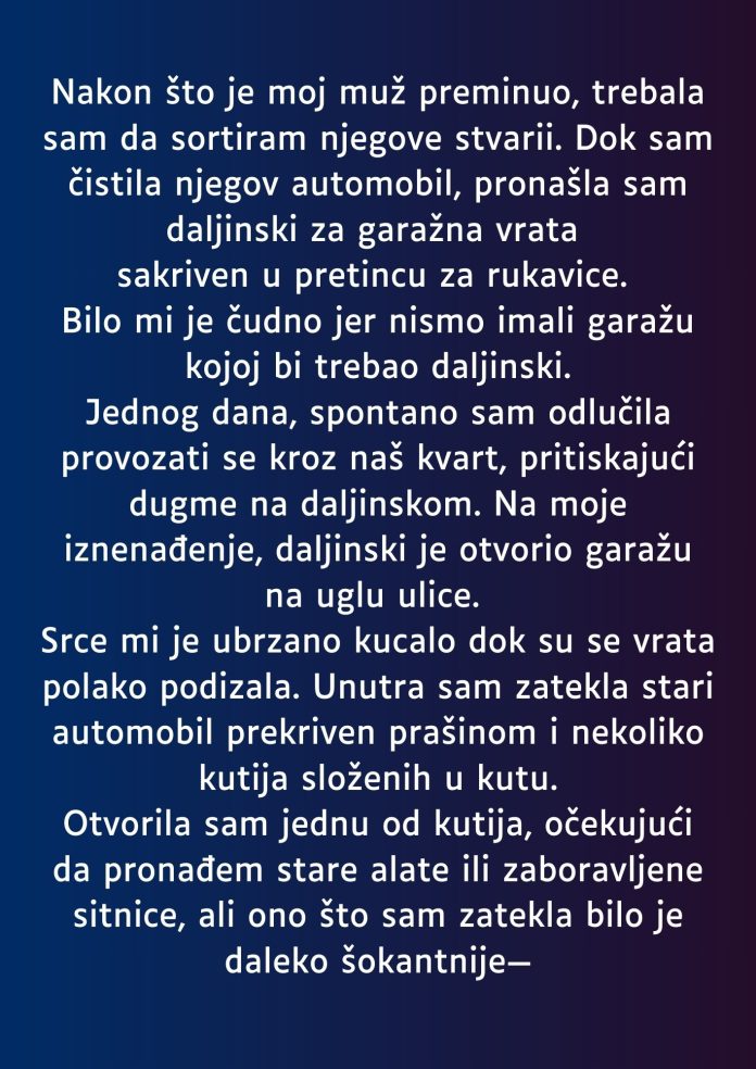Njena radoznalost nije je napustila. Iako je pokušavala da se fokusira na druge stvari, sve joj je bilo jasno – morala je saznati više. Jednog dana, spontano i iznenada, odlučila je da se provoza kroz njihov kvart, pritiskajući dugme na daljinskom. Na njeno iznenađenje, daljinski je zapravo otvorio garažu na uglu ulice. Srce joj je bilo ubrzano, dok su se vrata garaže polako podizala, otkrivajući stari automobil prekriven prašinom i nekoliko kutija složenih u kutu.