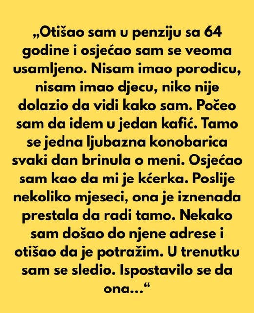 Tamo se svakog dana pojavljivala jedna ljubazna konobarica. Niko drugi nije mario za mene, ali ona bi me svaki put dočekala sa osmehom, pitala kako sam i dala mi malo svog vremena. Bila je to ona vrsta ljubaznosti koja nije bila preterana, ali je bila iskrena i toplina koju je nosila me je duboko dirala. Njeni postupci su mi ličili na pažnju koju nisam imao u poslednjim godinama. Osjećao sam se kao da mi je kćerka. Iako nikada nije govorila previše o svom životu, uvek je bila prisutna, pažljiva i ljubazna.