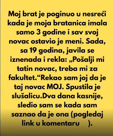 Odgovorio sam joj iskreno, objašnjavajući da novac koji mi je otac ostavio nije bio namijenjen za njezino obrazovanje, već da su ta sredstva bila za obrazovanje moje djece. Također sam istaknuo da sam je već godinama financijski podržavao na druge načine. Međutim, nakon toga, prekinula je svaki kontakt, bez daljnjeg objašnjenja. Osjećao sam se zbunjeno i povrijeđeno, jer je to djelovalo kao gubitak ne samo veze s njom, već i njezine vjere u mene.