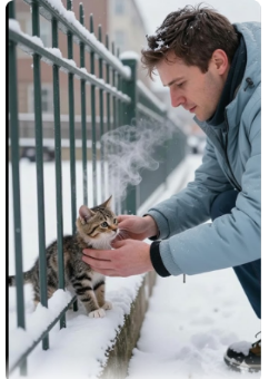 Vraćajući se kući, čuo sam tiho mijaukanje koje je dolazilo iz blizine vrta zgrade. Zvuk se smanjivao, ali je i dalje bio prisutan, kao da neko pokušava komunicirati sa mnom. Prišao sam bliže i ugledao malog mačića koji se teško kretao između metalnih potpornja ograde. Bio je očigledno uplašen, drhtao je, a svaki njegov pokušaj kretanja samo je povećavao njegovu paniku. Polako sam mu prišao, pokušavajući ga smiriti. Nakon nekoliko minuta, uspio sam ga nježno podići i staviti ga u zaštićeniji položaj blizu ulaza zgrade.