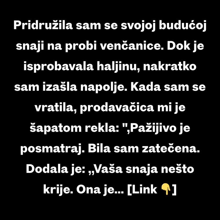 Dok je isprobavala različite modele, zazvonio mi je telefon, pa sam morala nakratko da izađem da se javim. Nije to trajalo dugo, ali kada sam se vratila, prodavačica mi je prišla tiho i sa izraženim zabrinutostima na licu i rekla: „Pažljivo posmatrajte vašu snaju.“ Bila sam zbunjena i nisam razumela šta želi da kaže. Pre nego što sam uspela da je upitam nešto više, ona je dodala: „Mislim da vaša snaja krije svoje pravo osećanje. Čula sam je kako pre vašeg dolaska govori da se pita da li je ova svadba dobra odluka. Plaši se da vi niste iskreno za njen brak sa vašim sinom.“