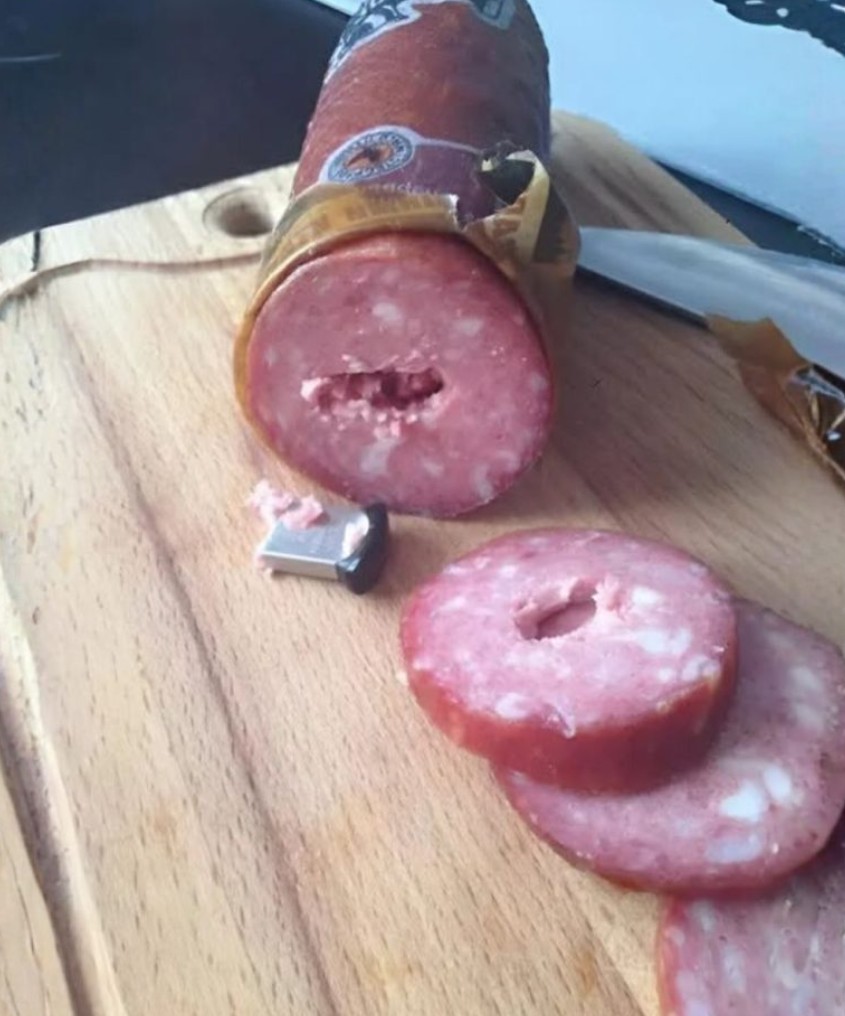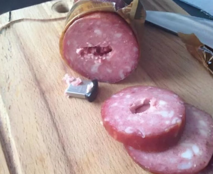 Međutim, sledećeg jutra, dok je pripremala omlet, nož je naišao na nešto tvrdo u kobasici. Pomislila je da su možda bile previše zaledjene, ali svaki pokušaj rezanja je bio neuspešan. Pomislila je da je možda nešto od pakovanja ostalo unutra, možda komadić folije, pa je odlučila da preseče kobasicu po dužini. Kad je to učinila, ono što je ugledala nije bilo ništa što bi očekivala — srebrni USB uređaj pokriven mesom i mastima.