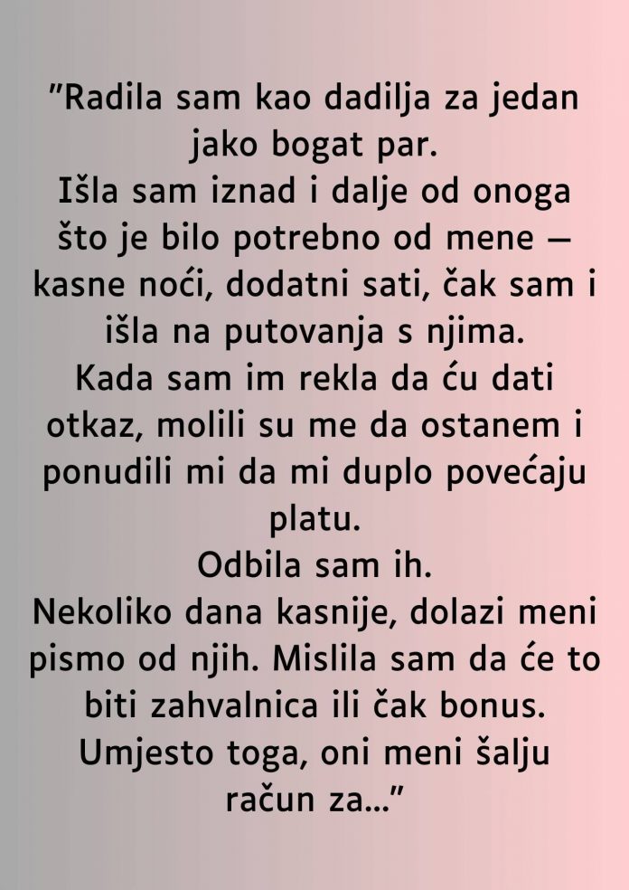 Razumem da imaju decu, da im život nije lak, ali ono što me boli je nedostatak poštovanja, saosećanja i dijaloga. Nisu me pitali, nisu diskutovali sa mnom, samo su doneli odluku kao da nisam osoba koja je godinama bila uz njih. Otvorila sam vrata njihovog doma i srce bez pitanja, a sada, kada imaju svoje planove, ja postajem višak. Ne tražim mnogo, samo da se prema meni postupa sa dostojanstvom. Da se pitaju, da me saslušaju. Da mi daju pravo da odlučim o svojoj sudbini.