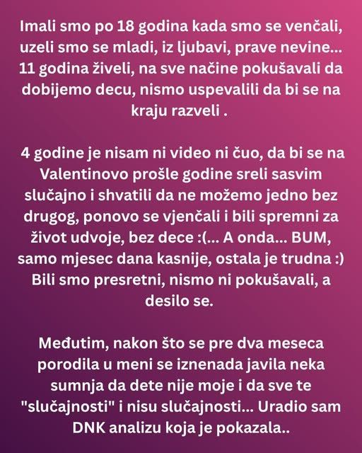 Međutim, sudbina je imala drugačije planove. Samo mesec dana nakon venčanja, žena je otkrila da je trudna, što je bio nevjerojatan šok za oboje. Osećali su ogromnu sreću, iako nisu planirali trudnoću, jer su želeli jednostavno uživati u svojoj ljubavi. Ali, iako su se veselili, nakon što je žena rodila, pojavila se sumnja. Muž nije mogao da se otarasi osećaja da nešto nije u redu, kao da je cijela situacija bila previše savršena da bi bila stvarno slučajna. Počeo je da se pita da li je zaista otac deteta, što je izgradilo još veću unutrašnju napetost. Iako je žena bila verna i nikada ga nije povredila, on je odlučio da uradi DNK test, koji je pokazao da je on zaista otac. Ipak, umesto da oseti olakšanje, počeo je da se oseća loše zbog svega – sramio se svojih sumnji i nije znao kako da se oslobodi tog odvratnog osećaja krivice i sumnje.