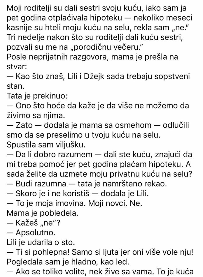 Ova priča postavlja pitanje kako postavljanje granica u porodici može biti ključno za mentalno zdravlje i samopoštovanje. Iako odnos s roditeljima nije bio isti kao pre, žena je naučila važnost zaštite svojih prava i imovine. Iako nije bila u potpunosti spokojna, bar su njeni granice sada bile poštovane. Ova situacija nije bila samo test za njene roditelje, već i za nju – test da li je dovoljno hrabra da, čak i u ljubavi i poštovanju, zadrži svoj integritet.
