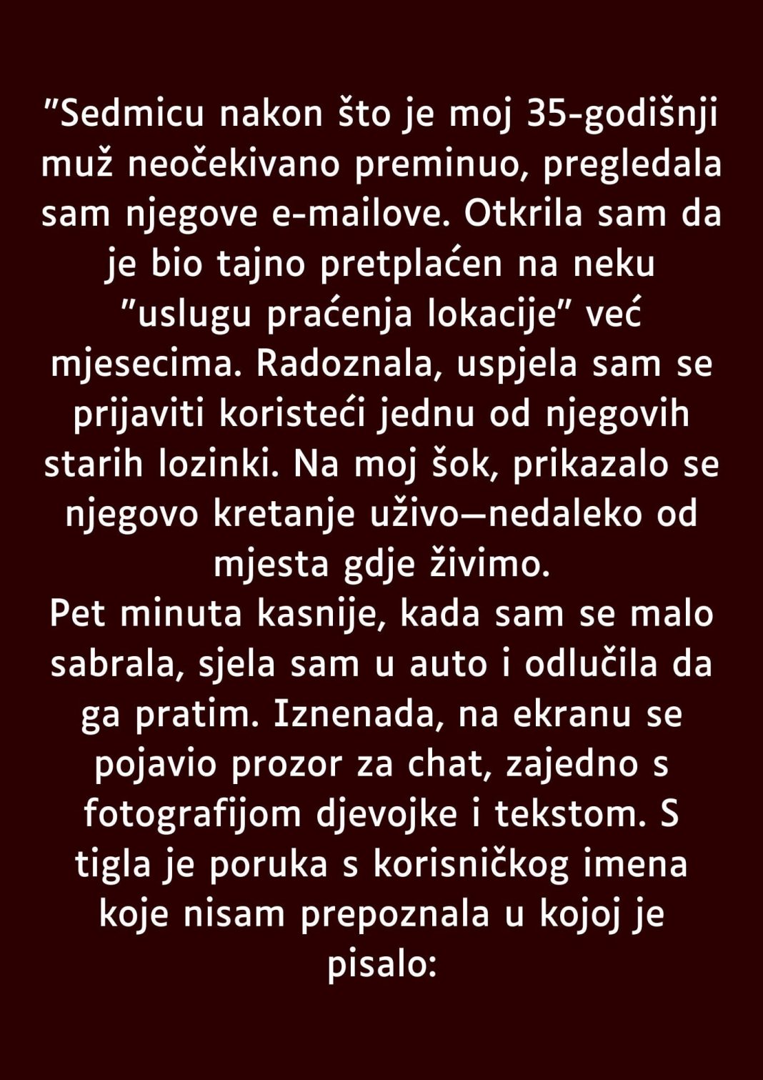 Tako sam otkrila da je bio pretplaćen na uslugu za praćenje lokacije. Pretplata je trajala mjesecima, a ja o tome nisam imala pojma. Radoznalost je pobijedila tugu i pokušala sam da se prijavim koristeći njegove stare lozinke. Ubrzo sam uspjela ući u sistem.
