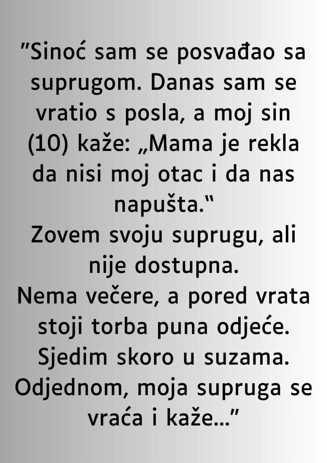 Njegov desetogodišnji sin je stajao pred njim, blijed i nesiguran, kao da se boji da izgovori ono što mu je majka rekla. Zatim je tiho, gotovo šapatom, izgovorio rečenicu koja mu je presjekla dah: