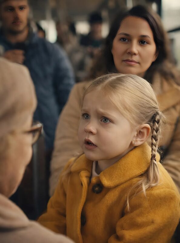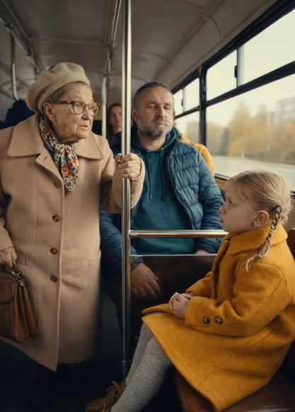 • Djevojčica, u svom žutom kaputiću, tiho je promatrala kroz prozor. Kada je žena nježno prišla i zamolila je da ustane i ustupi mjesto, odgovor koji je djevojčica dala izazvao je pravu tišinu među putnicima. Naivno, s dječjim pitanjima koja dolaze iz nesvjesne istine, djevojčica je upitala: „Zašto tako?” Starija žena je, iako joj je bilo teško, objašnjavala da je umorna i da je boli noge. Tada je djevojčica, razmišljajući, postavila još jedno pitanje: „Bako, kada si bila mala, jesi li svima ustupila mjesto?” Žena je odgovorila sigurno: „Da, naravno.” Ali tada je djevojčica pitala još jedno pitanje koje je izazvalo šok među svima: „Svima – i muškarcima, i djeci, i ženama?”