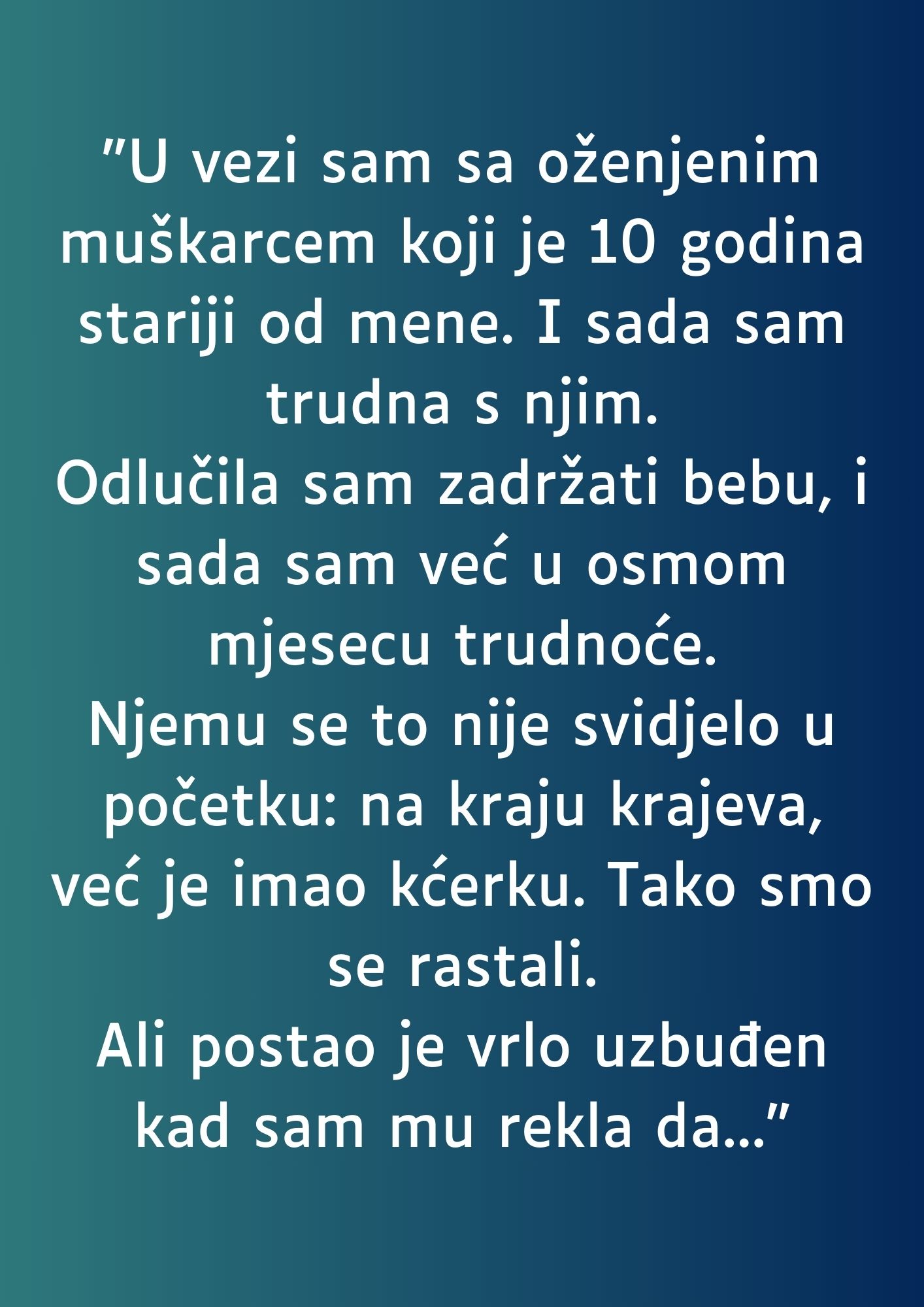 Nikada nisam mogla da zamislim da ću se naći u ovakvoj situaciji. Bila sam u vezi sa oženjenim muškarcem, starijim od mene deset godina, mužem i ocem, čovekom čiji je život bio već utemeljen i obavezan. Od samog početka znala sam da naš odnos nosi sa sobom teret tajne i osećaj krivice, ali moje srce nije želelo da sluša razum. Umesto da razmišljam o posledicama, živela sam u trenutku, u onome što mi je donosilo osećaj pažnje i sigurnosti. Sve se promenilo kada sam saznala da sam trudna — trenutak koji je zauvek preokrenuo moj život.